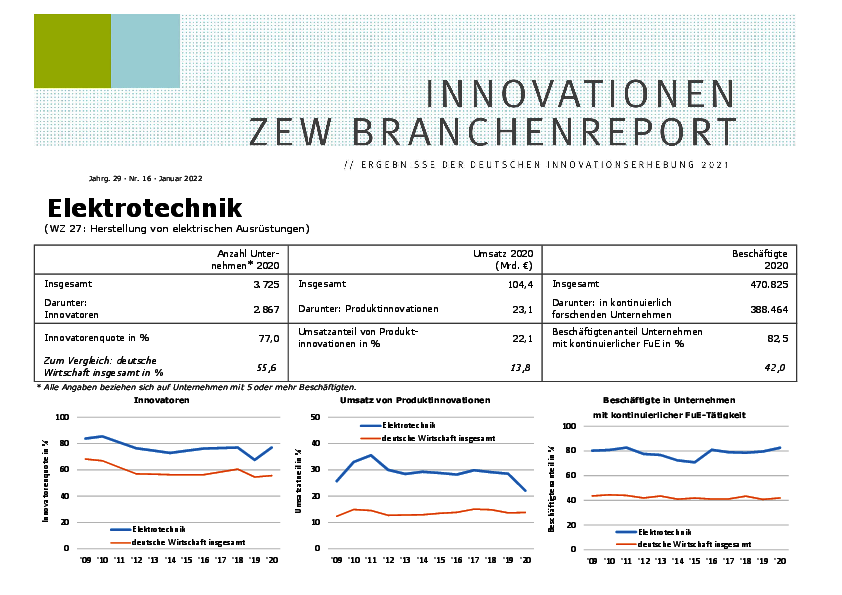 Der Branchenreport Innovation für die Branche Elektrotechnik stellt die Innovationsleistung der Branche im Jahr 2021 dar. Der Anteil der Unternehmen mit Innovationen lag bei 77,0 %. Die Innovationsausgaben stagnierten gegenüber dem Vorjahr bei 8,55 Mrd. €. Der Anteil der Unternehmen mit kontinuierlicher FuE lag bei 38 %. Der Beschäftigungsanteil von Unternehmen mit kontinuierlicher FuE betrug 82,5 %.