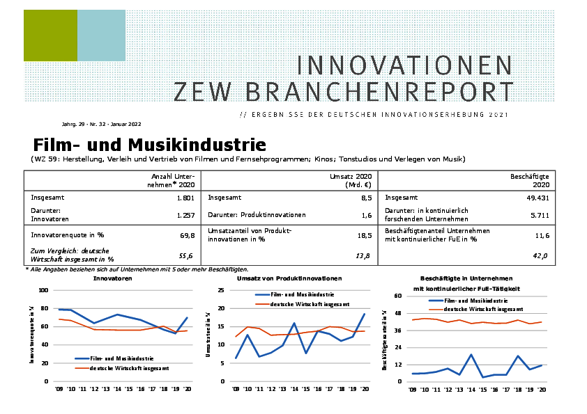 Der Branchenreport Innovation für die Branche Film- und Musikdienste stellt die Innovationsleistung der Branche im Jahr 2021 dar. Der Anteil der Unternehmen mit Innovationen lag bei 52,7 %. Die Innovationsausgaben stiegen gegenüber dem Vorjahr um 1 % auf 0,25 Mrd. €. Der Unternehmensanteil mit Produktinnovationen lag bei 32 % und der Unternehmensanteil mit Prozessinnovationen lag bei 47%.