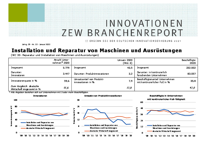 Der Branchenreport Innovation für die Branche Installation und Reparatur von Maschinen und Ausrüstungen stellt die Innovationsleistung der Branche im Jahr 2021 dar. Der Anteil der Unternehmen mit Innovationen lag bei 54,2 %. Die Innovationsausgaben stiegen gegenüber dem Vorjahr um 11 % und beliefen sich auf 1,19 Mrd. €. Der Anteil der Unternehmen mit kontinuierlicher FuE lag bei 12 %. Der Beschäftigungsanteil von Unternehmen mit kontinuierlicher FuE betrug 33,9 %.