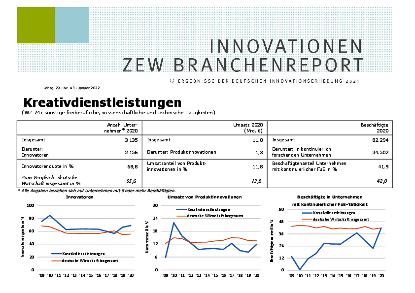Der Branchenreport Innovation für die Branche Kreativdienstleistungen stellt die Innovationsleistung der Branche im Jahr 2021 dar. Der Anteil der Unternehmen mit kontinuierlicher Forschung und Entwicklung lag bei 7 %. 68,8 % der Unternehmen führten Produkt- oder Prozessinnovationen ein. Produktinnovationen leisten 11,8 % zum gesamten Umsatz der Branche. Die Innovationsausgaben lagen bei 0,32 Mrd. €. Das sind 2,9 % des Branchenumsatzes.