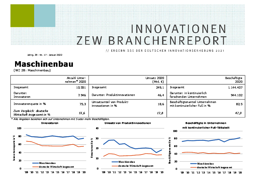 Der Branchenreport Innovation für die Branche Maschinenbau stellt die Innovationsleistung der Branche im Jahr 2021 dar. Der Anteil der Unternehmen mit Innovationen lag bei 73,1 %. Die Innovationsausgaben stiegen gegenüber dem Vorjahr um 7 % und betrugen 17,78 Mrd. €. Der Umsatzanteil mit Produktinnovationen lag bei 16 %.