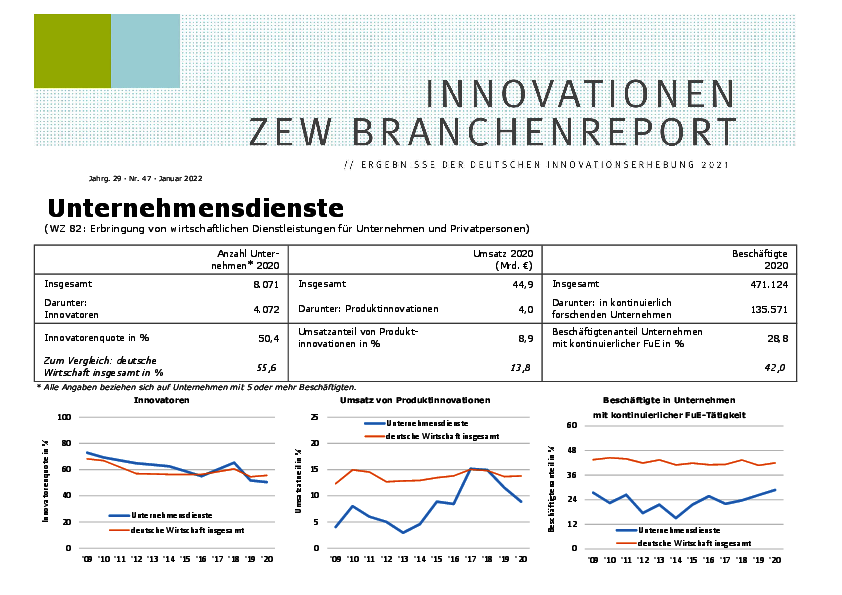 Der Branchenreport Innovation für die Branche Unternehmensdienste stellt die Innovationsleistung der Branche im Jahr 2021 dar. Der Anteil der Unternehmen mit Produktinnovationen lag bei 29 %. Die Innovationsausgaben stiegen gegenüber dem Vorjahr von 0,58 Mrd. € auf 0,65 Mrd. € an, was 1,5 % des Umsatzes der Branche entspricht.
