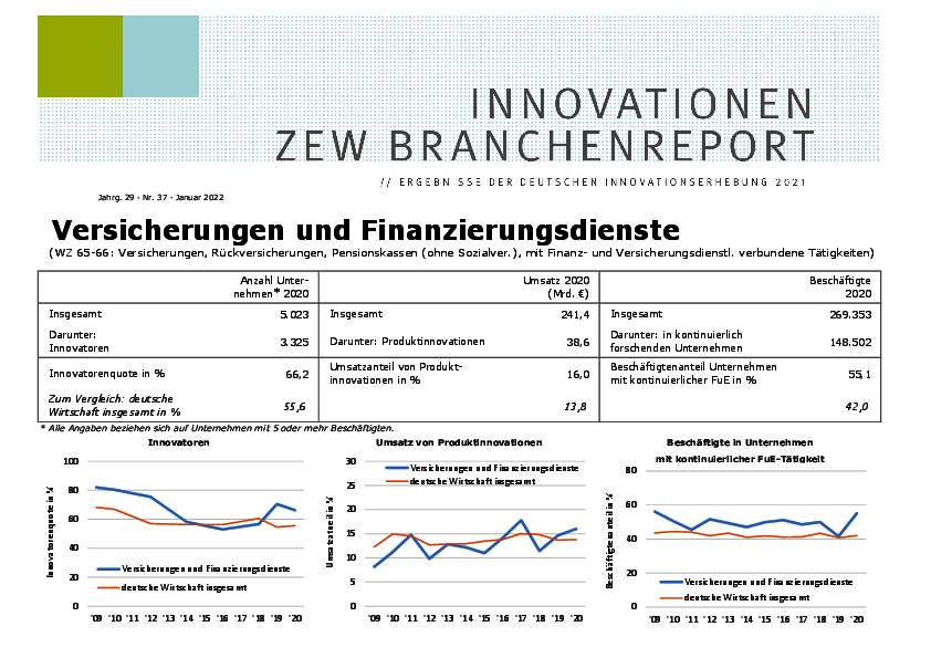 Der Branchenreport Innovation für die Branche Versicherungen und Finanzierungsdienste stellt die Innovationsleistung der Branche im Jahr 2021 dar. Der Anteil der Unternehmen mit kontinuierlicher Forschung und Entwicklung lag bei 5 %. 66,2 % der Unternehmen führten Produkt- oder Prozessinnovationen ein. Mit Produktinnovationen wurde ein Umsatz von 38,6 Mrd. € erzielt, das sind 16,0 % des gesamten Branchenumsatzes.