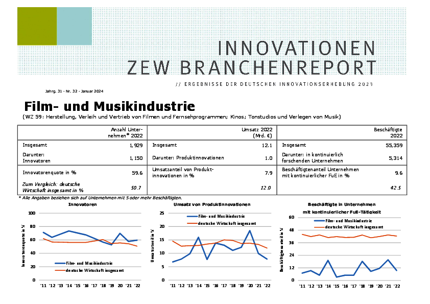Der Branchenreport Innovation für die Branche Film- und Musikdienste stellt die Innovationsleistung der Branche im Jahr 2023 dar. Der Anteil der Unternehmen mit Innovationen lag bei 59,6 %. Die Innovationsausgaben fielen gegenüber dem Vorjahr um 15 % auf 0,17 Mrd. €. Der Unternehmensanteil mit Produktinnovationen lag bei 23 % und der Unternehmensanteil mit Prozessinnovationen lag bei 58 %.