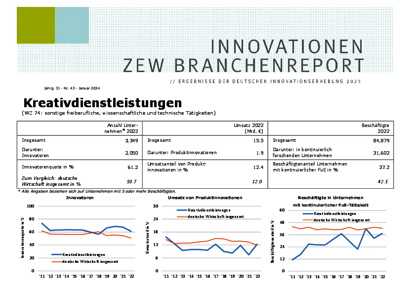Der Branchenreport Innovation für die Branche Kreativdienstleistungen stellt die Innovationsleistung der Branche im Jahr 2023 dar. Der Anteil der Unternehmen mit kontinuierlicher Forschung und Entwicklung lag bei 15 %. 61,2 % der Unternehmen führten Produkt- oder Prozessinnovationen ein. Produktinnovationen leisten 12,4 % zum gesamten Umsatz der Branche. Die Innovationsausgaben lagen bei 0,37 Mrd. €. Das sind 2,4 % des Branchenumsatzes.