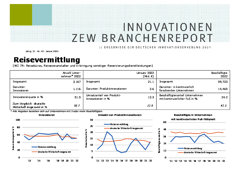 Der Branchenreport Innovation für die Branche Reisevermittlung stellt die Innovationsleistung der Branche im Jahr 2023 dar. Der Anteil der Unternehmen mit Produktinnovationen lag bei 23 %. Die Innovationsausgaben stiegen gegenüber dem Vorjahr um 43 %. Der Umsatzanteil mit Produktinnovationen sank auf 6,3 %.