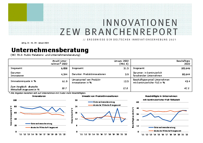 Der Branchenreport Innovation für die Branche Unternehmensberatung stellt die Innovationsleistung der Branche im Jahr 2023 dar. Der Anteil der Unternehmen mit Innovationen lag bei 61,9 %. Die Innovationsausgaben sanken gegenüber dem Vorjahr um 6 %. Der Umsatzanteil mit Produktinnovationen stieg auf 12,5 %.