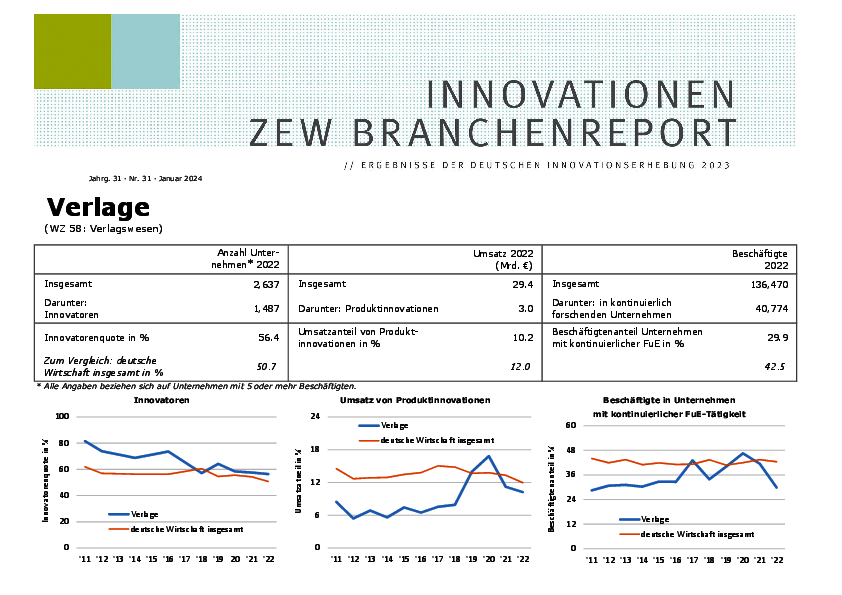Der Branchenreport Innovation für die Branche Verlage stellt die Innovationsleistung der Branche im Jahr 2023 dar. Der Anteil der Unternehmen mit Produktinnovationen lag bei 46 %. Die Innovationsausgaben fielen gegenüber dem Vorjahr um 20 % auf 0,86 Mrd. € und betrugen 2,9 % des Umsatzes. Der Anteil der Ausgaben für Forschung und Entwicklung unter den Innovationsausgaben lag bei 67 %.
