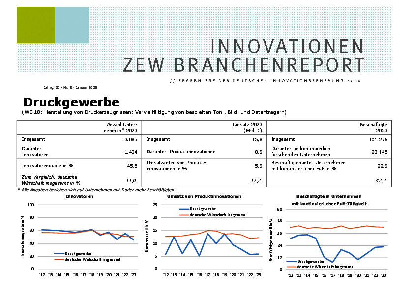 Der Branchenreport Innovation für die Branche Druckgewerbe stellt die Innovationsleistung der Branche im Jahr 2023 dar. Der Anteil der Unternehmen mit Innovationen lag bei 45,5 %. Die Innovationsausgaben fielen gegenüber dem Vorjahr um 29 % auf 0,35 Mrd. €. Der Anteil der Unternehmen mit kostensenkenden Prozessinnovationen betrug 19 %.
