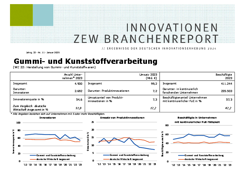 Der Branchenreport Innovation für die Branche Gummi- und Kunststoffverarbeitung stellt die Innovationsleistung der Branche im Jahr 2023 dar. Der Anteil der Unternehmen mit Innovationen lag bei 54,6 %. Die Innovationsausgaben stiegen gegenüber dem Vorjahr um 1 % und betrugen 2,24 Mrd. €. Der Umsatzanteil mit Produktinnovationen belief sich auf 7,3 %.