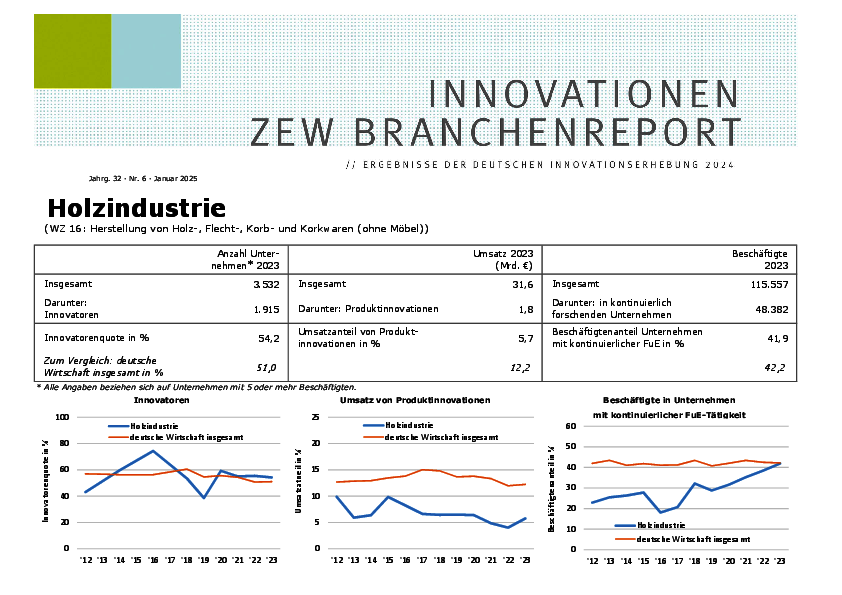 Der Branchenreport Innovation für die Branche Holzindustrie stellt die Innovationsleistung der Branche im Jahr 2023 dar. Der Anteil der Unternehmen mit Innovationen lag bei 54,2 %. Die Innovationsausgaben fielen gegenüber dem Vorjahr um 28 % und beliefen sich auf 0,25 Mrd. €. Der Umsatzanteil mit Produktinnovationen betrug 5,7 %.