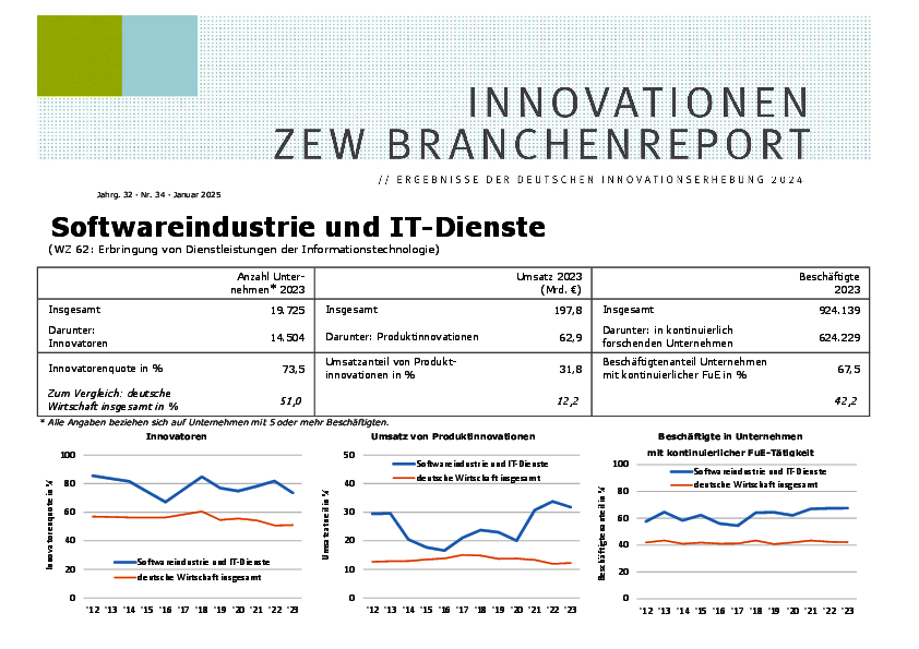 Der Branchenreport Innovation für die Branche Softwareindustrie und IT-Dienste stellt die Innovationsleistung der Branche im Jahr 2023 dar. Der Anteil der Unternehmen mit Produktinnovationen lag bei 58 %. Die Innovationsausgaben betrugen, wie im Vorjahr 9,1 % des Umsatzes. Der Anteil der Ausgaben für Forschung und Entwicklung unter den Innovationsausgaben lag bei 75 %.