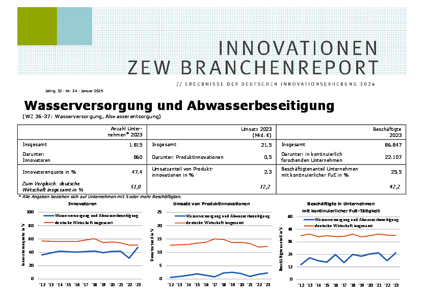Der Branchenreport Innovation für die Branche Wasserversorgung und Abwasserbeseitigung stellt die Innovationsleistung der Branche im Jahr 2023 dar. Der Anteil der Unternehmen mit Innovationen lag bei 47,4 %. Die Innovationsausgaben stiegen gegenüber dem Vorjahr um 10 % und betrugen 0,25 Mrd. €. Der Umsatzanteil mit Produktinnovationen stieg auf 2,3 %.