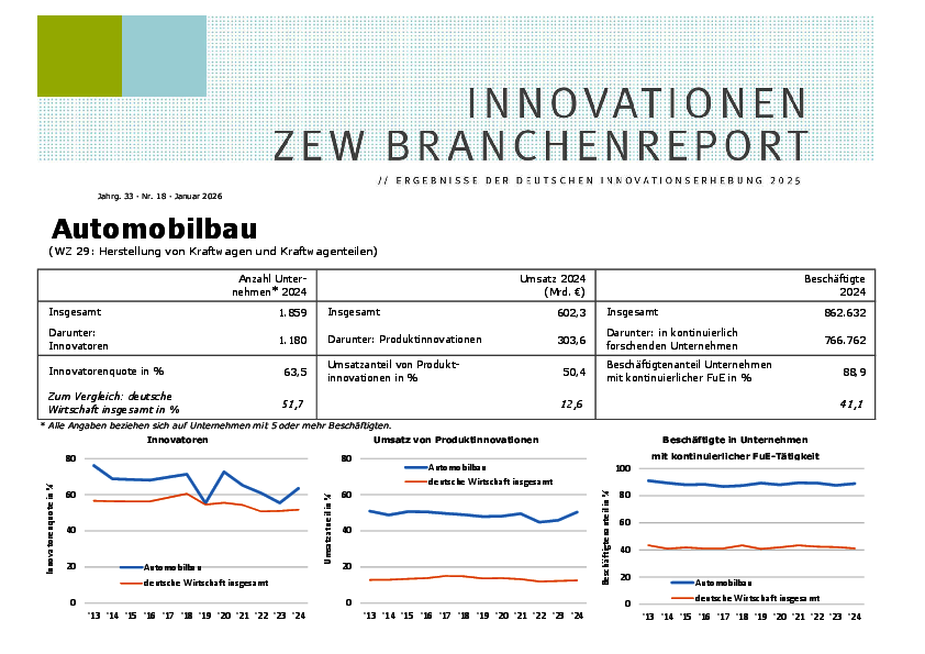 Der Branchenreport Innovation für die Branche Automobilbau stellt die Innovationsleistung der Branche im Jahr 2024 dar. Der Anteil der Unternehmen mit Innovationen lag bei 63,5 %. Die Innovationsausgaben stiegen gegenüber dem Vorjahr um 2 % auf 56,33 Mrd. €. Der Umsatzanteil mit Produktinnovationen betrug 50,4 %. Der Anteil der Unternehmen mit kontinuierlicher FuE lag bei 35 %.