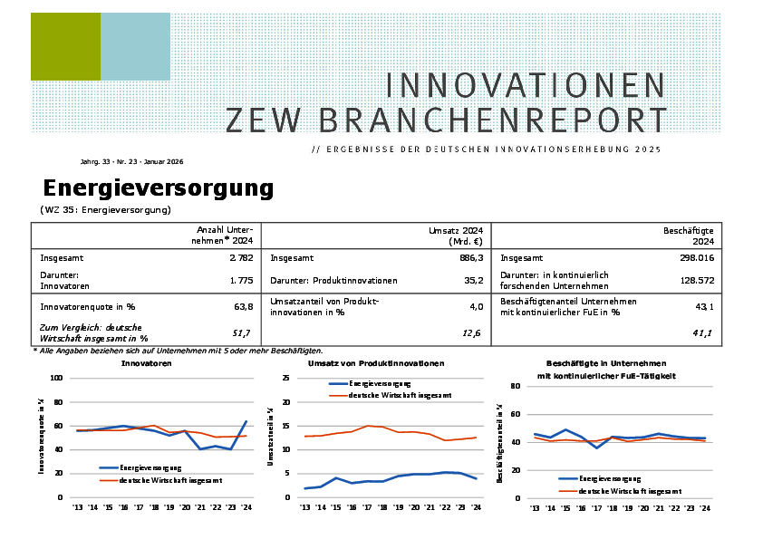 Der Branchenreport Innovation für die Branche Energieversorgung stellt die Innovationsleistung der Branche im Jahr 2024 dar. Der Anteil der Unternehmen mit Innovationen lag bei 63,8 %. Die Innovationsausgaben im Berichtsjahr stiegen gegenüber dem Vorjahr um 20 % auf 4,44 Mrd. €. Der Anteil der Unternehmen mit kontinuierlicher FuE betrug 13 %.