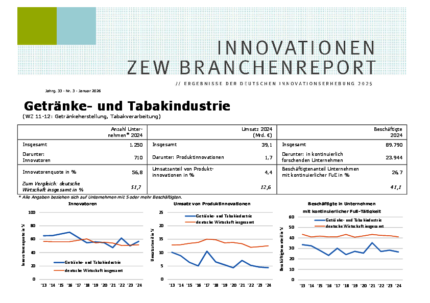 Der Branchenreport Innovation für die Branche Getränke- und Tabakindustrie stellt die Innovationsleistung der Branche im Jahr 2024 dar. Der Anteil der Unternehmen mit Innovationen lag bei 56,8 %. Der Anteil der Innovationsausgaben am Branchenumsatz (Innovationsintensität) belief sich im Berichtsjahr auf 0,6 %. Der Umsatzanteil mit Produktinnovationen betrug 4,4 %.