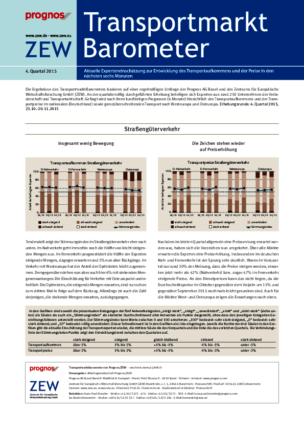 Zu diesen zentralen Ergebnissen kommt das TransportmarktBarometer von Prognos/ZEW im vierten Quartal 2015. Für die Erhebung befragen die Prognos AG, Basel, und das Zentrum für Europäische Wirtschaftsforschung (ZEW), Mannheim, vierteljährlich rund 250 Spitzenkräfte aus der Transportwirtschaft und der verladenden Wirtschaft, wie sie die Entwicklung der Transportmengen und der Transportpreise auf Sicht des kommenden halben Jahres einschätzen.
