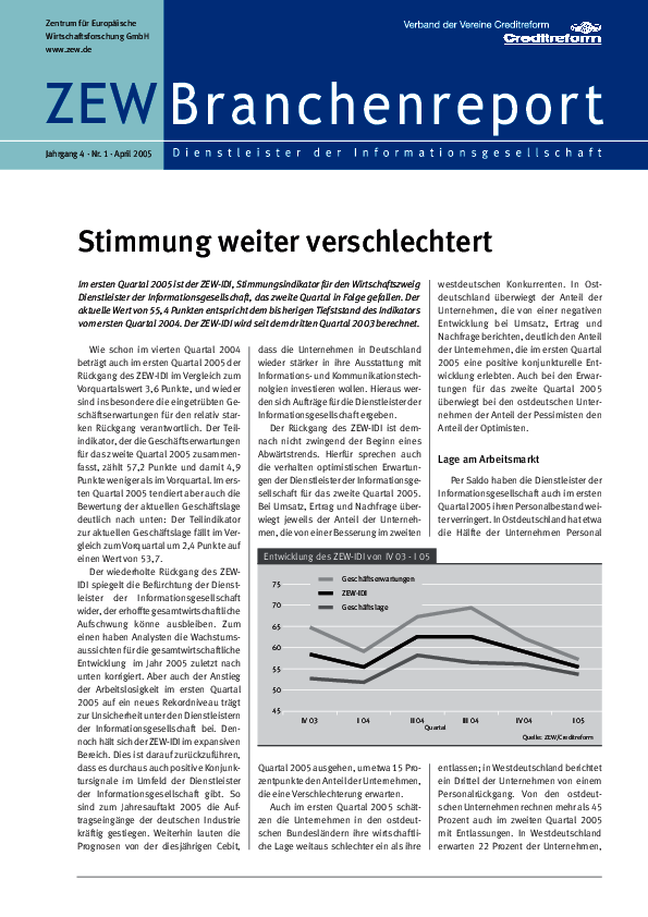 Im ersten Quartal 2005 ist der ZEW-IDI, Stimmungsindikator für den Wirtschaftszweig Dienstleister der Informationsgesellschaft, das zweite Quartal in Folge gefallen. Der aktuelle Wert von 55,4 Punkten entspricht dem bisherigen Tiefststand des Indikators vom ersten Quartal 2004. Der ZEW-IDI wird seit dem dritten Quartal 2003 berechnet.
