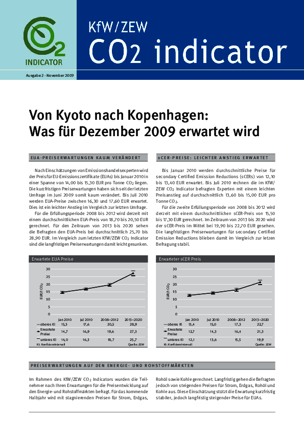 KfW/ZEW-CO2-Panel // 2009Die kurzfristigen Preiserwartungen für European Emission Allowances (EUAs) bis Juli 2010 sind im vergleich zur letzten Befragung vom Juni 2009 leicht angestiegen und liegen derzeit zwischen 16,30 und 17,60 EUR. Die langfristigen Preiserwartungen für EUAs für die Zeiträume bis 2012 und von 2013 bis 2020 sind im Vergleich zur letzten Umfrage hingegen leicht zurückgegangen. In der aktuellen Ausgabe des KfW/ZEW CO2 Indicators wurden die Teilnehmer zu ihren Erwartungen hinsichtlich der Kopenhagener Klimakonferenz befragt. Sie sehen ein verbindliches und sofort wirksames Ziel zur Reduzierung von Treibhausgasen als wichtigstes Thema auf der Klimakonferenz. Die USA und "Emerging Economies" wie China, Indien oder Brasilien werden als die wichtigsten Verhandlungsparteinen gesehen.