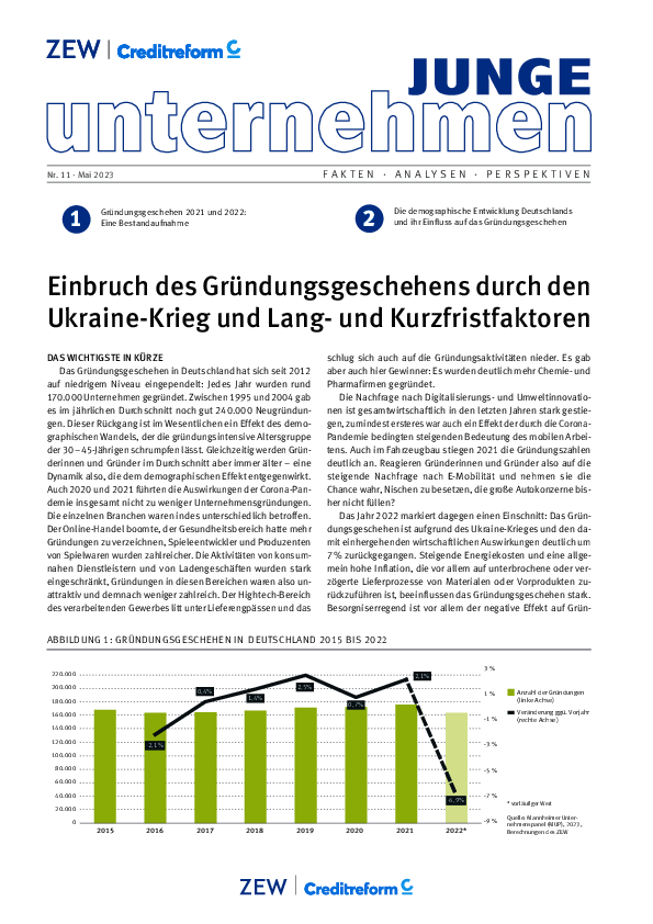 Mit der Publikation JUNGE UNTERNEHMEN informieren das ZEW und Creditreform über das Gründungsgeschehen in Deutschland. In der Publikationsreihe sind aktuelle Analysen und Forschungsergebnisse zum Thema Gründungen sowie Berichte zur Entwicklung von jungen Unternehmen enthalten.