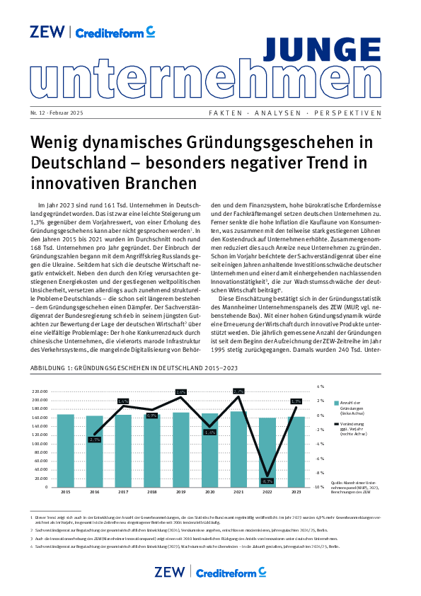 Mit der Publikation JUNGE UNTERNEHMEN informieren das ZEW und Creditreform über das Gründungsgeschehen in Deutschland. In der Publikationsreihe sind aktuelle Analysen und Forschungsergebnisse zum Thema Gründungen sowie Berichte zur Entwicklung von jungen Unternehmen enthalten.