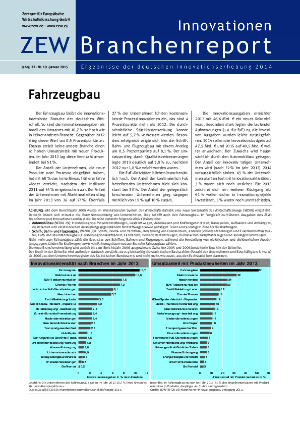 Der Fahrzeugbau bleibt die innovationsintensivste Branche der deutschen Wirtschaft. So sind die Innovationsausgaben als Anteil des Umsatzes mit 10,7% so hoch wie in keiner anderen…