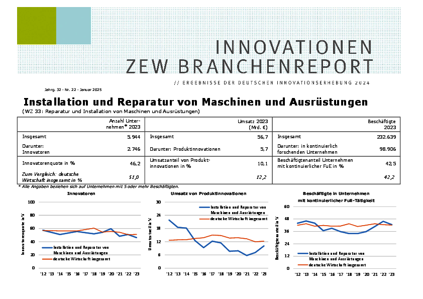 Der Branchenreport Innovation für die Branche Installation und Reparatur von Maschinen und Ausrüstungen stellt die Innovationsleistung der Branche im Jahr 2023 dar. Der Anteil…