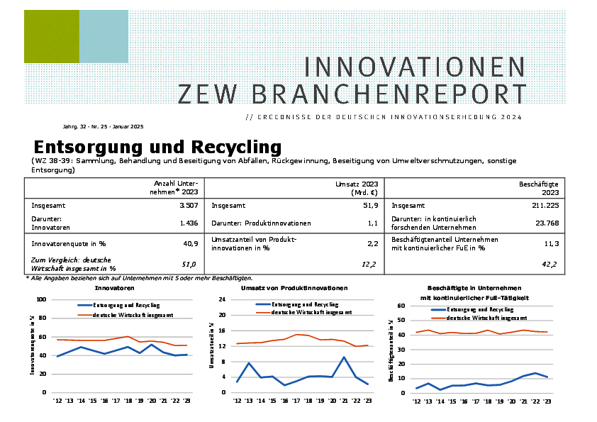 Der Branchenreport Innovation für die Branche Entsorgung und Recycling stellt die Innovationsleistung der Branche im Jahr 2023 dar. Der Anteil der Unternehmen mit…