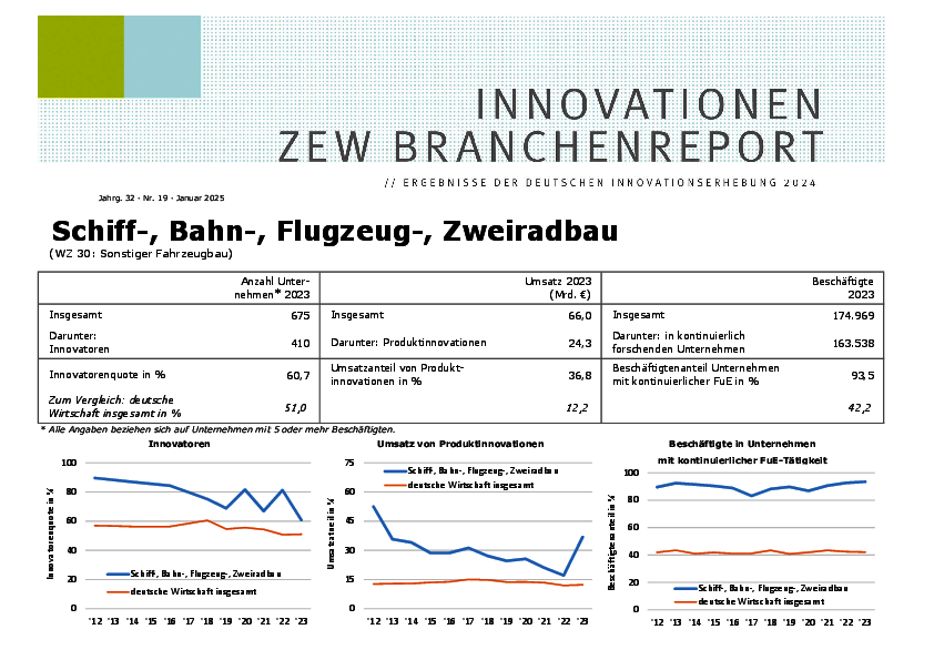 Der Branchenreport Innovation für die Branche Schiff-, Bahn-, Flugzeug- und Zweiradbau stellt die Innovationsleistung der Branche im Jahr 2023 dar. Der Anteil der Unternehmen mit…