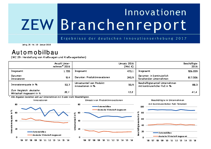 Der Branchenreport Innovation für die Branche Automobilbau stellt die Innovationsleistung der Branche im Jahr 2016 dar. Der Anteil der Unternehmen mit Innovationen lag bei 52,7…
