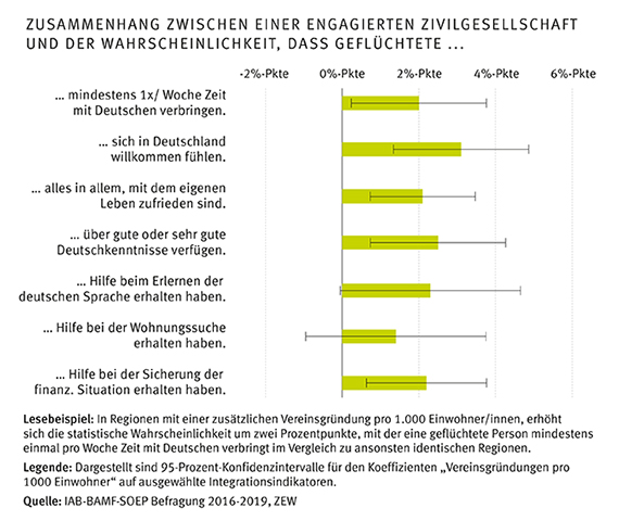 untermauert die Bedeutung von ehrenamtlichem Engagement für die Integration von Geflüchteten mit repräsentativen Zahlen. In Regionen mit besonders hohem ehrenamtlichem Engagement können Geflüchtete [...] ur, Wirtschaftskraft und Arbeitsmarktlage. Frauen und Geflüchtete mit niedrigem Bildungsstand profitieren beim Spracherwerb besonders stark von engagierten Ehrenamtlichen vor Ort. Geflüchtete mit [...] und der Wahrscheinlichkeit, dass Geflüchtete eine Arbeit finden, feststellen. Die Ergebnisse deuten darauf hin, dass die Unterstützung durch Ehrenamtliche sich auch in einem verbesserten Zugang zu staatlichen