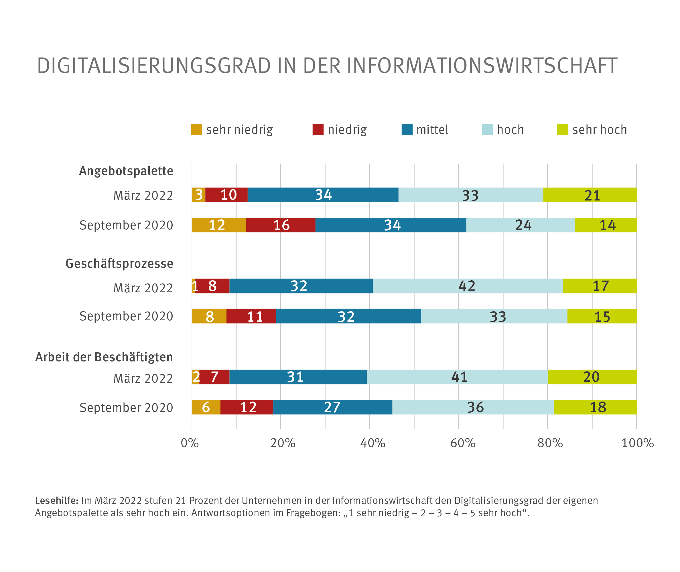 Pressemitteilungen // 08.06.2022Angebotspalette wurden die Unternehmen im März 2022 auch nach ihrem Digitalisierungsgrad bei den Geschäftsprozessen sowie der Arbeit der Beschäftigten befragt. Für die Selbsteinschätzung des Digitalisierungsgrades [...] wurden die Unternehmen bereits im September 2020 zum Digitalisierungsgrad ihrer Angebotspalette, Geschäftsprozesse und der Arbeit der Beschäftigten befragt. Durch einen Vergleich der Angaben lässt sich das Ausmaß [...] Vor zwei Jahren lagen diese Werte noch bei 38 bzw. 18 Prozent“, sagt Erdsiek. Die eigenen Geschäftsprozesse stufen im März 2022 derweil 59 Prozent in der Informationswirtschaft und 35 Prozent im Vera