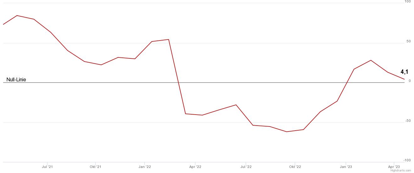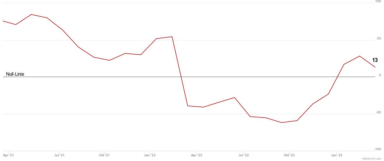 Pressemitteilungen // 18.04.2023xis der Banken. Zum anderen belasten die immer noch hohen Inflationsraten und die international restriktive Geldpolitik. Positiv ist, dass die Gefahr einer akuten Krise auf den internationalen Finanzmärkten [...] Finanzmärkten nicht mehr gesehen wird: Die Ertragsaussichten für Banken und Versicherungsunternehmen haben sich gegenüber dem Vormonat verbessert und liegen wieder deutlich im positiven Bereich“, kommentiert