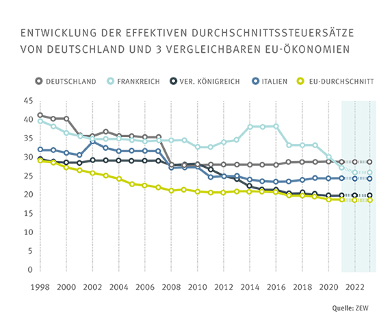 unterliegen Kapitalgesellschaften in Deutschland der höchsten Belastung nach den USA. Die effektive Durchschnittssteuerbelastung für Unternehmen zeigt an, wie attraktiv ein Standort für hoch rentable Investitionen [...] Die dritte Steuerreformstufe senkt die effektive Steuer- und Abgabenbelastung der Unternehmen bei der Beschäftigung von hoch qualifizierten Arbeitskräften deutlich. Während ein Unternehmen derzeit noch [...] Unternehmen nach der Reform nur noch 174.000 Euro aufwenden. - Dies entspricht einer Senkung der effektiven durchschnittlichen Steuer- und Abgabenbelastung bei hoch qualifizierten Mitarbeitern von 47,6 auf