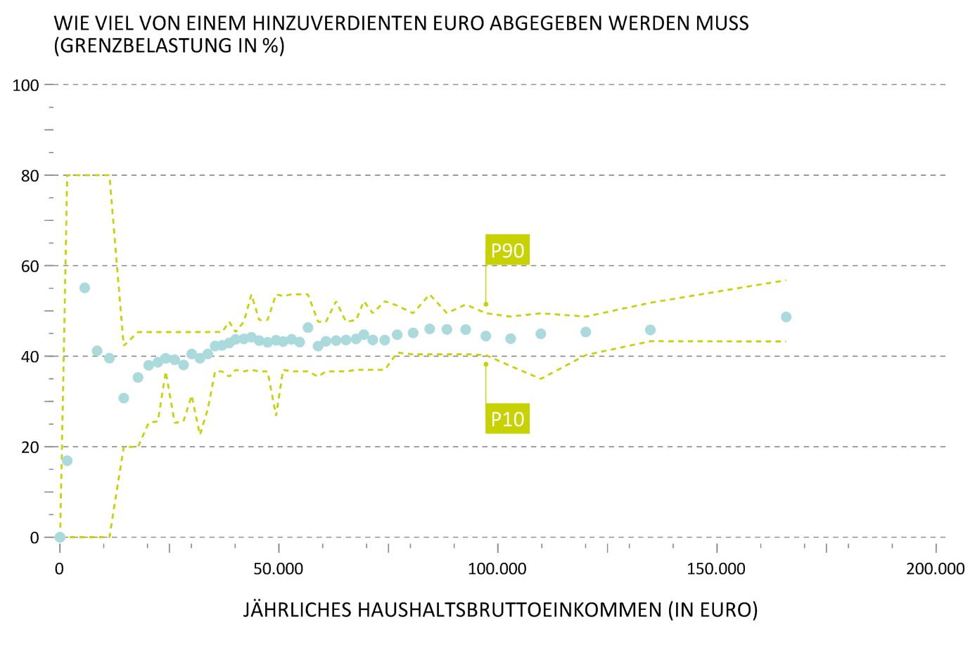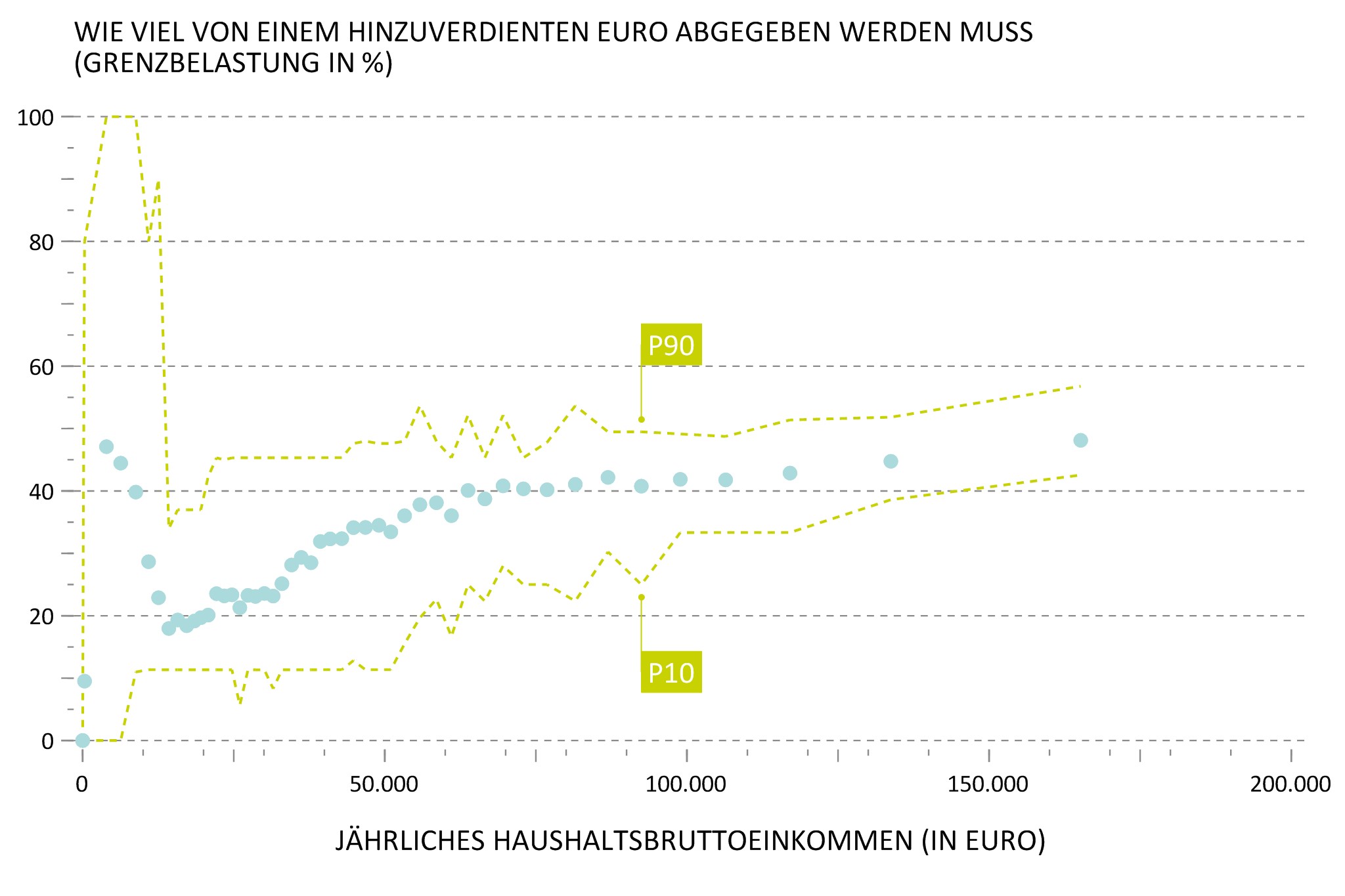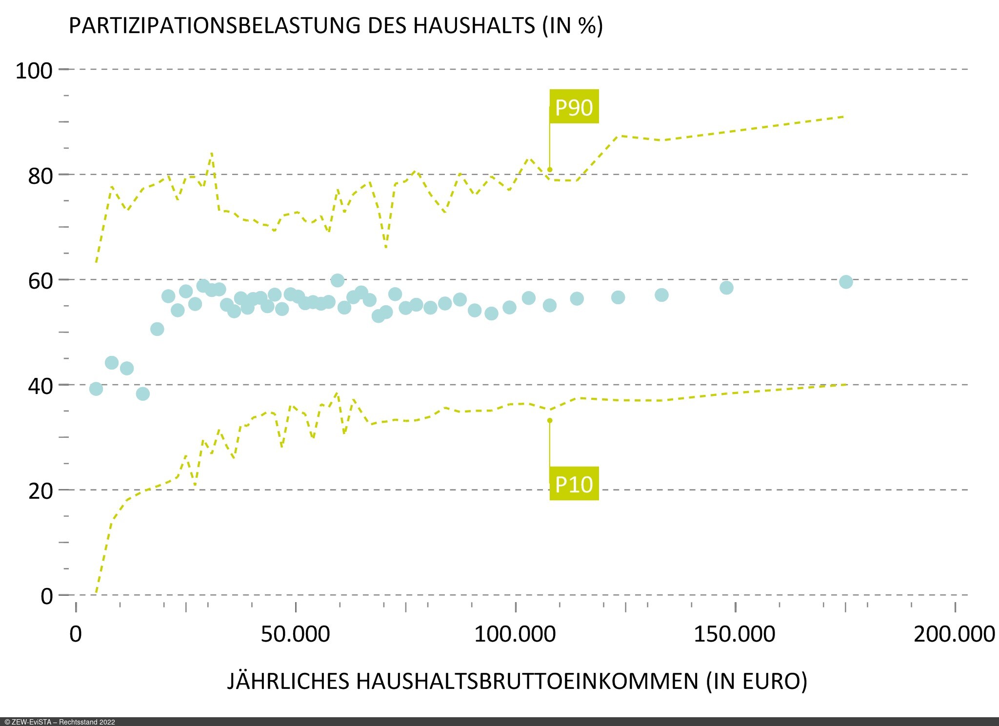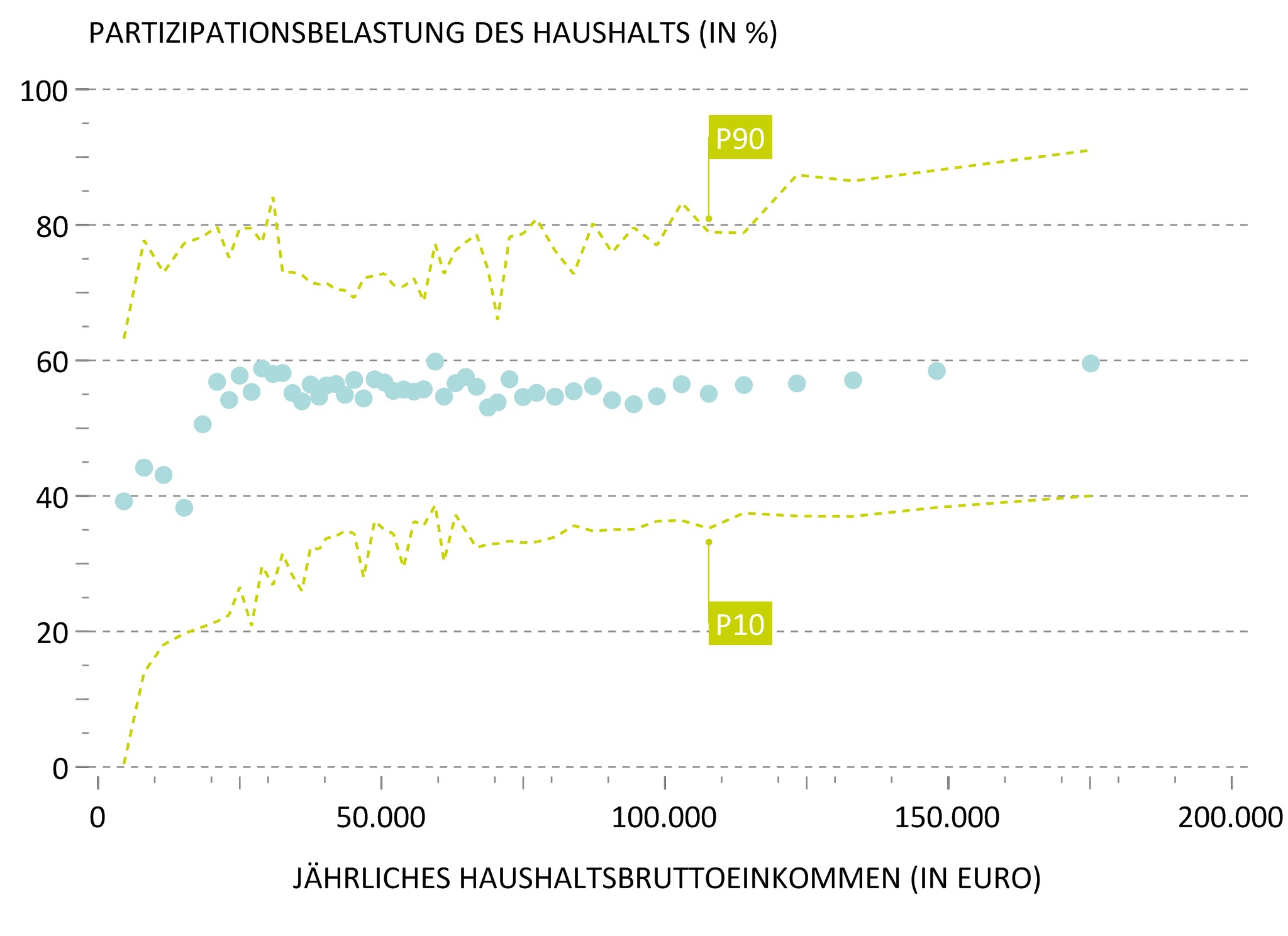 Die Grafik beschreibt die durchschnittliche Partizipationsbelastung im Bruttohaushaltseinkommen. Der Durchschnitt wird über alle Haushalte des Sozio-ökonomischen Panels (SOEP) gebildet. Die Haushalte wurden gemäß ihres Bruttohaushaltseinkommens in etwa 50 Gruppen eingeteilt. Die gestrichelten grünen Linien zeigen die Streuung der Partizipationsbelastung der Haushalte innerhalb einer Gruppe an. Die untere grüne Linie gibt die Grenzbelastung des 10. Perzentils einer jeden Gruppe an, die obere grüne Linie stellt die Grenzbelastung des 90. Perzentils dar. Die durchschnittliche Partizipationsbelastung steigt bei niedrigen Bruttoeinkommen zunächst stark an und bleibt anschließend weitgehend konstant.