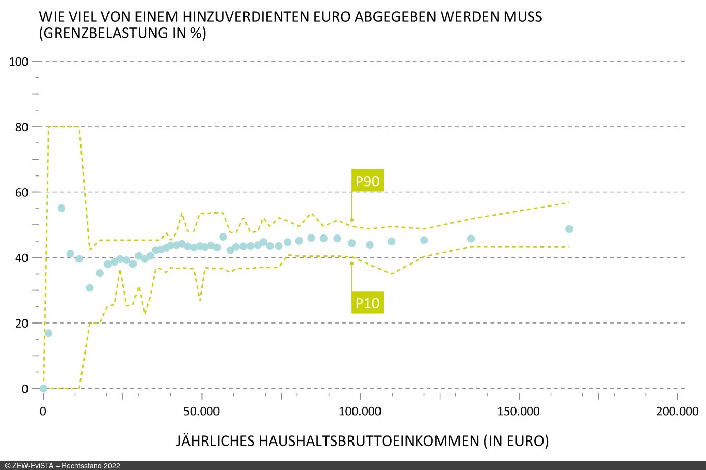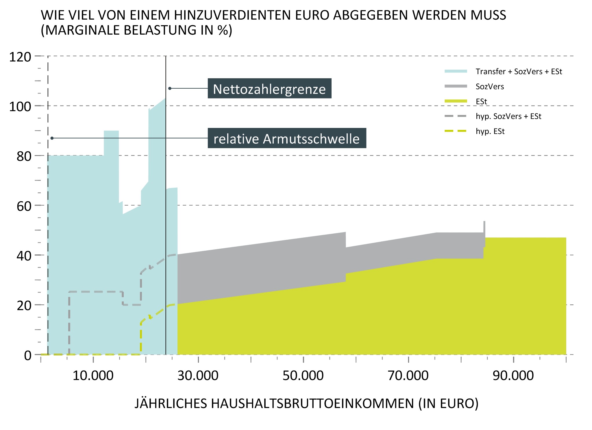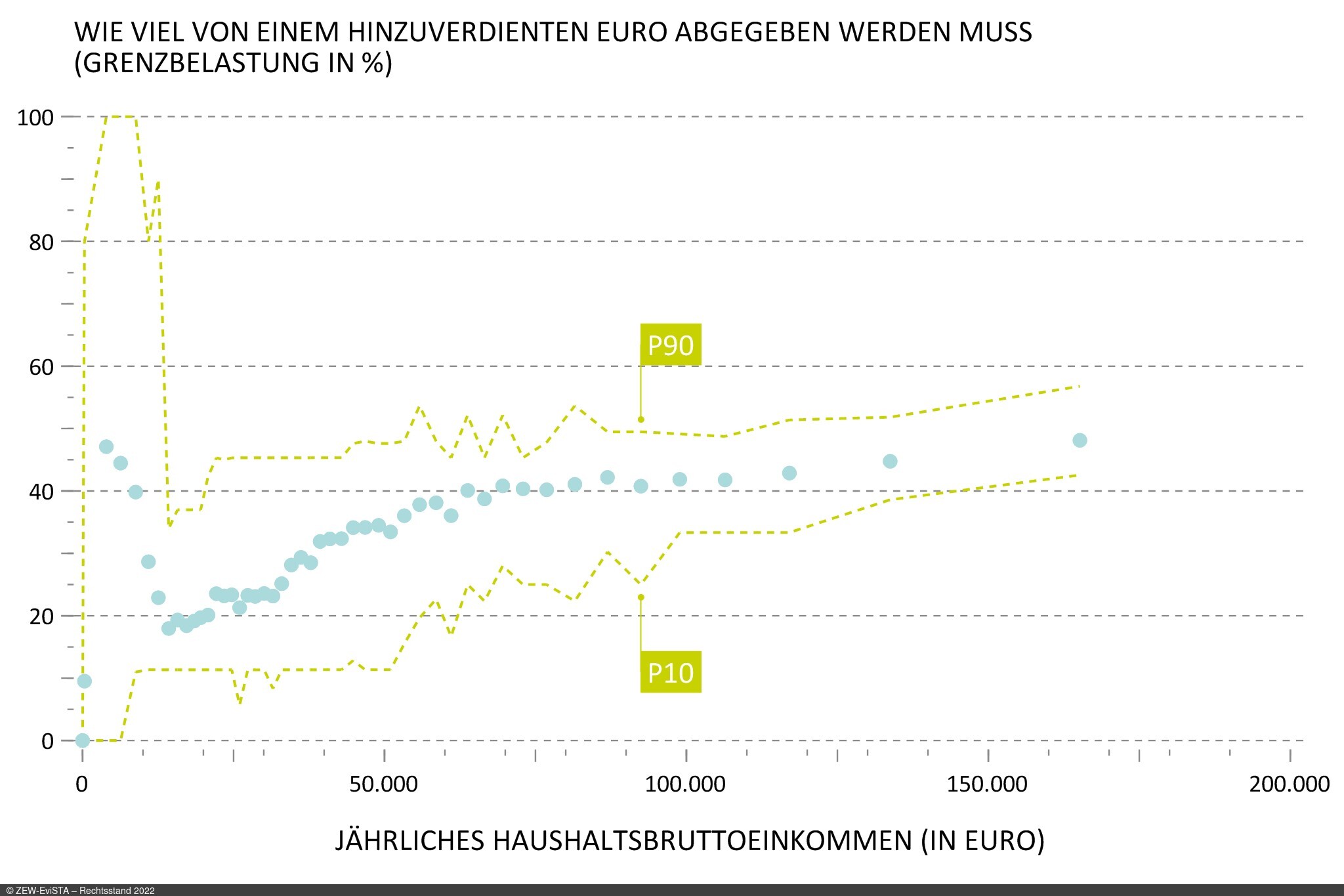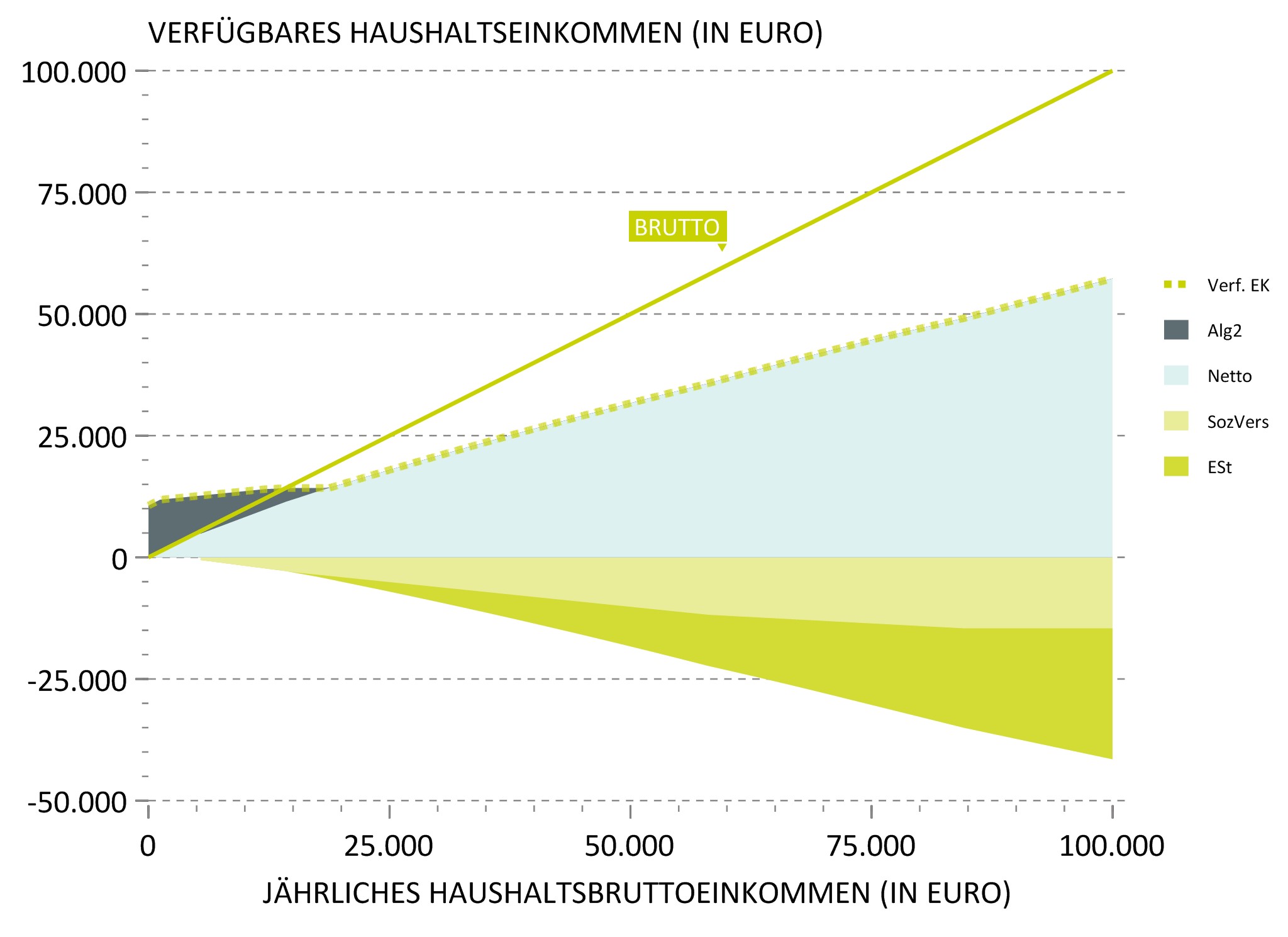 Die Grafik beschreibt die durchschnittliche Partizipationsbelastung im Bruttohaushaltseinkommen. Der Durchschnitt wird über alle Haushalte des Sozio-ökonomischen Panels (SOEP) gebildet. Die Haushalte wurden gemäß ihres Bruttohaushaltseinkommens in etwa 50 Gruppen eingeteilt. Die gestrichelten grünen Linien zeigen die Streuung der Partizipationsbelastung der Haushalte innerhalb einer Gruppe an. Die untere grüne Linie gibt die Grenzbelastung des 10. Perzentils einer jeden Gruppe an, die obere grüne Linie stellt die Grenzbelastung des 90. Perzentils dar. Die durchschnittliche Partizipationsbelastung steigt bei niedrigen Bruttoeinkommen zunächst stark an und bleibt anschließend weitgehend konstant.