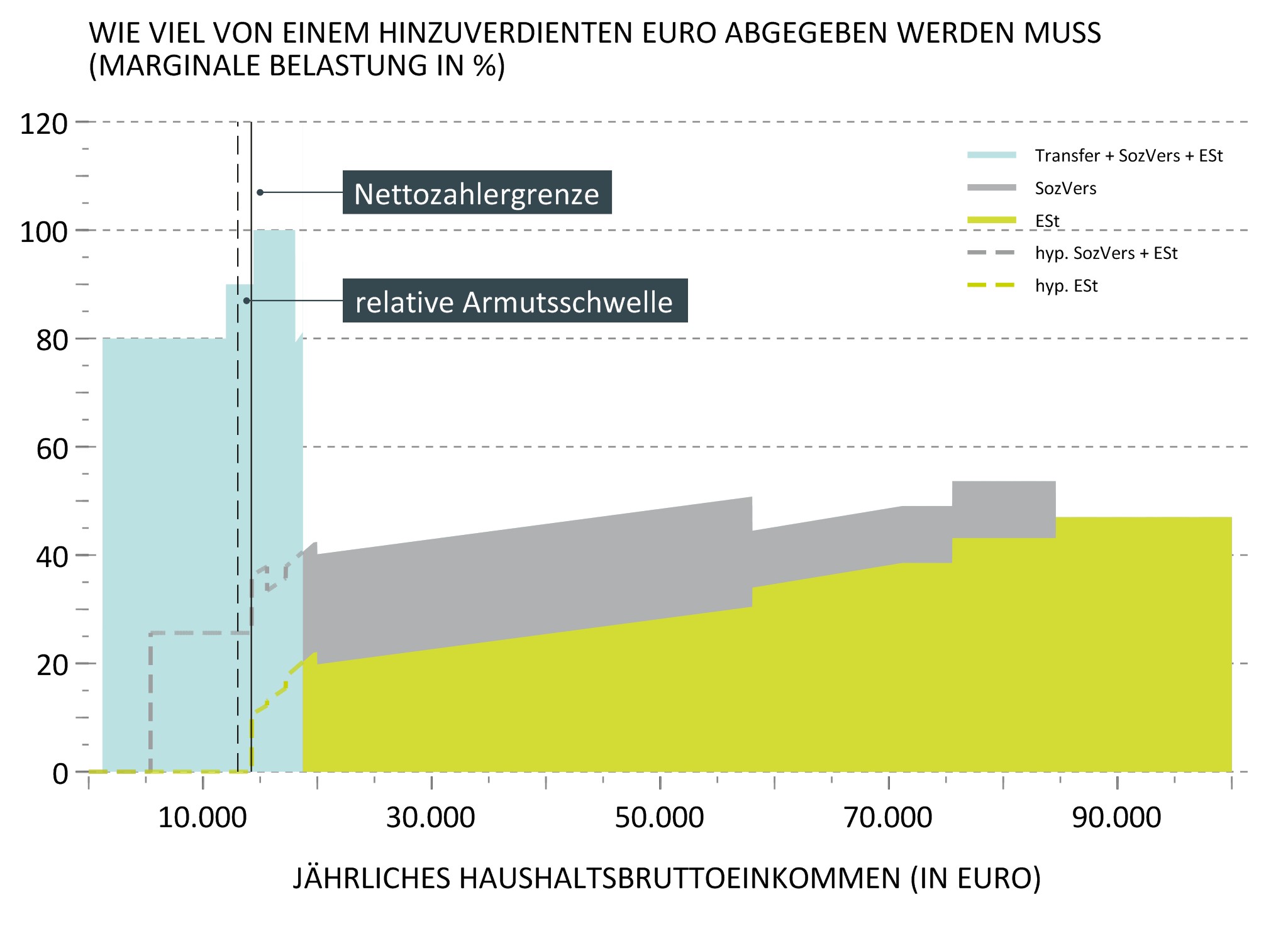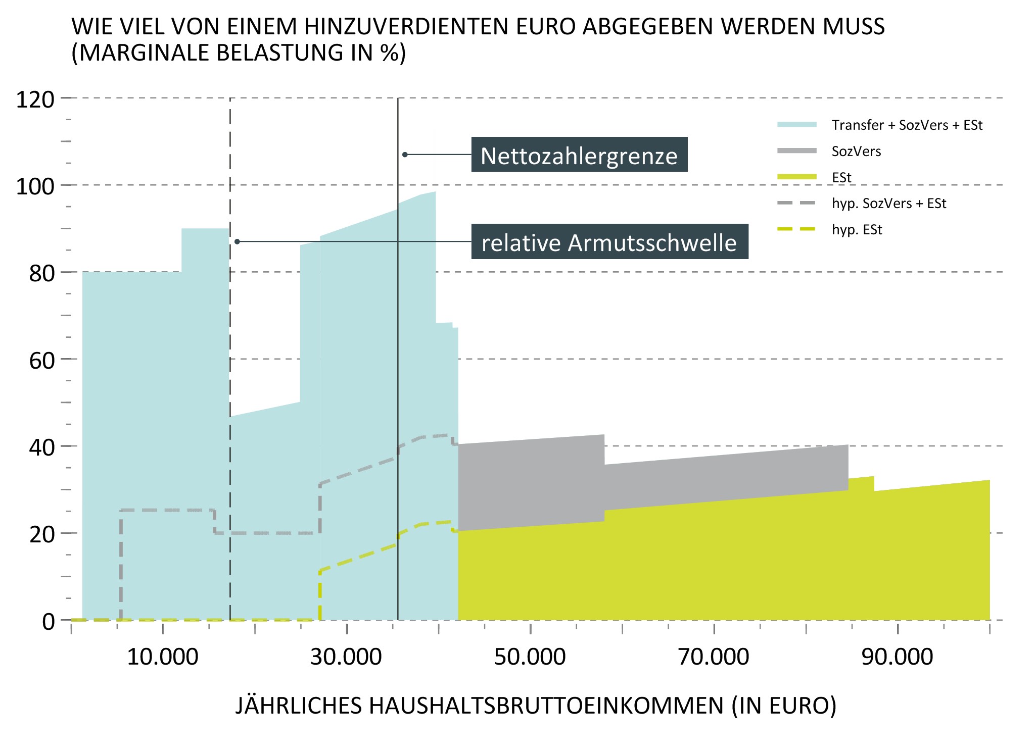Die Grenzbelastung oder auch marginale Belastung gibt in Prozent an, wie viel von einem hinzuverdienten Euro aufgrund von Steuern, Sozialabgaben und Transferentzugsraten wieder abgegeben wird. Die Grenzbelastung ist ein gängiges Maß, um die Anreize zur Ausweitung oder Reduzierung der Erwerbstätigkeit zu beurteilen. Die effektive Grenzbelastung wird auf Haushaltsebene gemäß der folgenden Formel berechnet:
