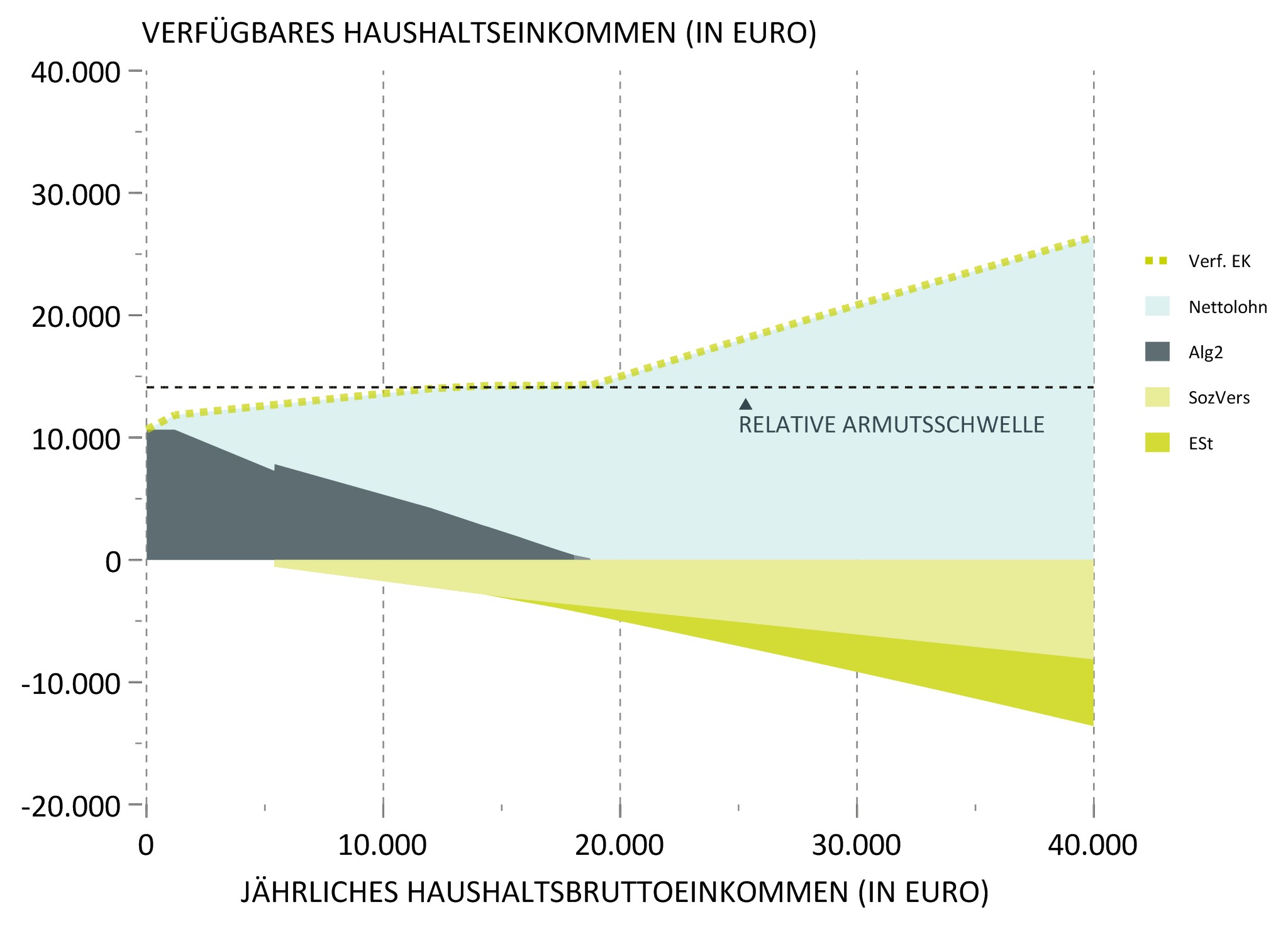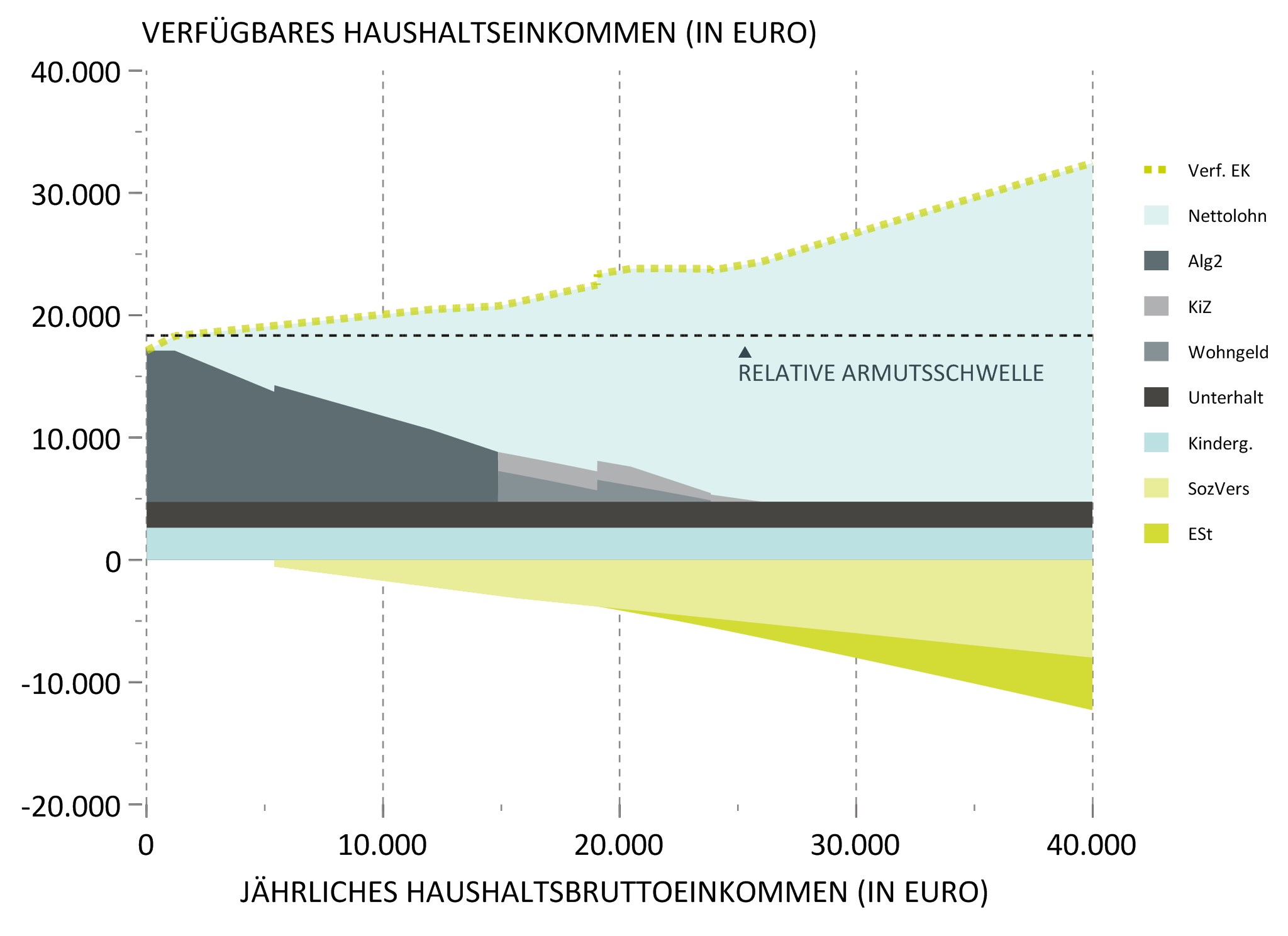 Zur Vereinfachung wird angenommen, dass der Haushalt ausschließlich Einkommen aus nicht selbstständiger Arbeit bezieht. Bei der Einkommensteuerveranlagung werden die pauschalen Arbeitnehmer-Freibeträge bei den Werbungskosten und der Sonderausgaben-Pauschbetrag berücksichtigt. Es werden keine darüber hinausgehenden Werbungskosten oder Sonderausgaben erfasst. Anders als bei der Simulation auf Basis der SOEP-Daten werden also auch keine Kinderbetreuungskosten steuerlich berücksichtigt.