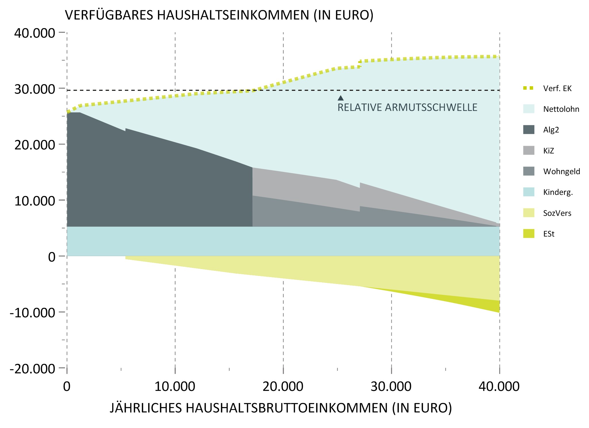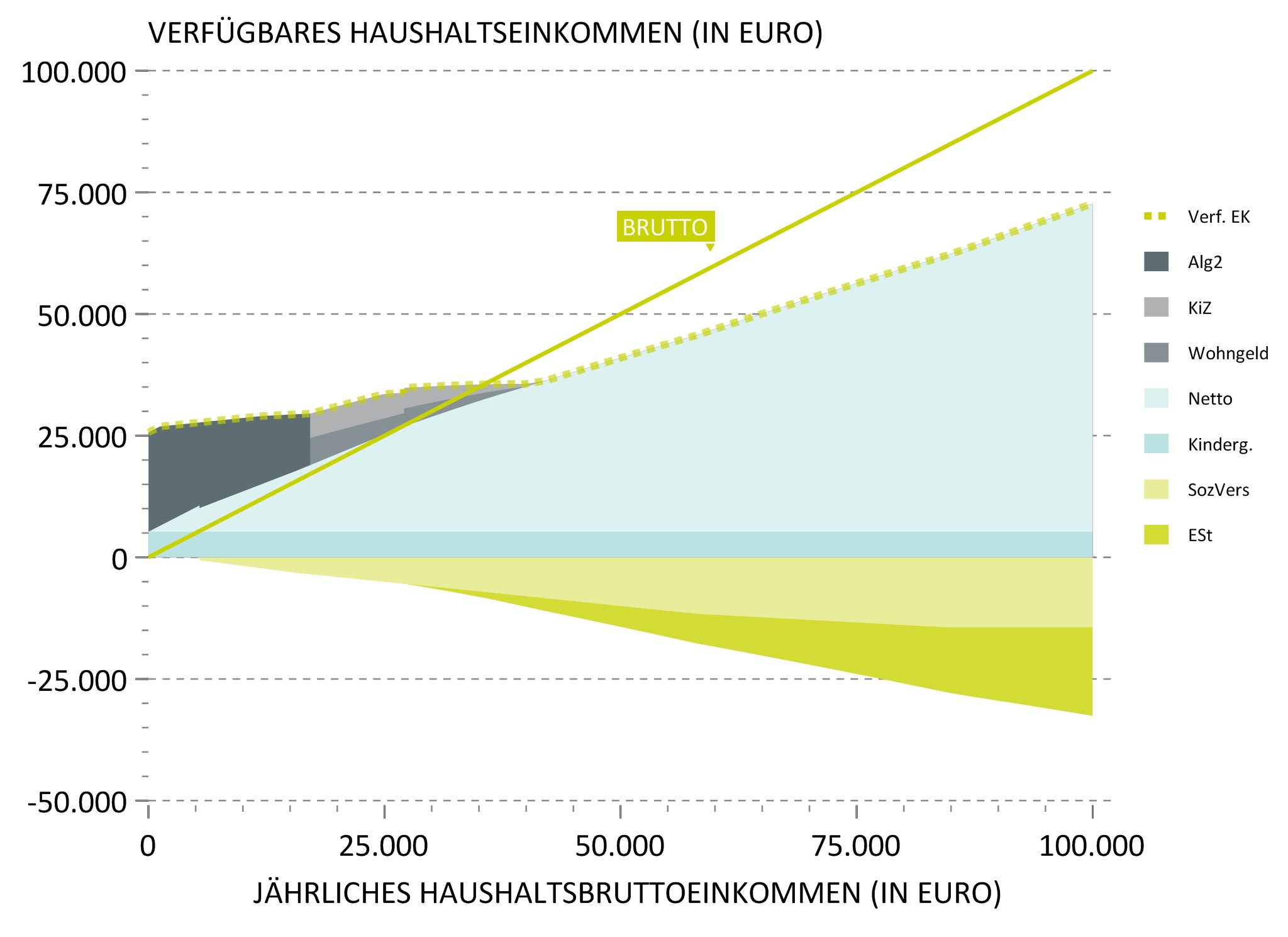 Die Nettozahlergrenze gibt das Einkommen an, bei dem ein Haushalt genauso viele Transferzahlungen (Grundsicherung, Kinderzuschlag, Wohngeld, Kindergeld) erhält, wie er an Einkommensteuer und Solidaritätszuschlag sowie Sozialversicherungsbeiträgen zahlt.