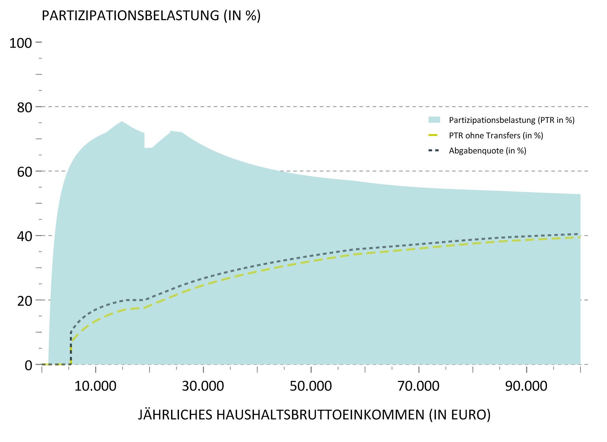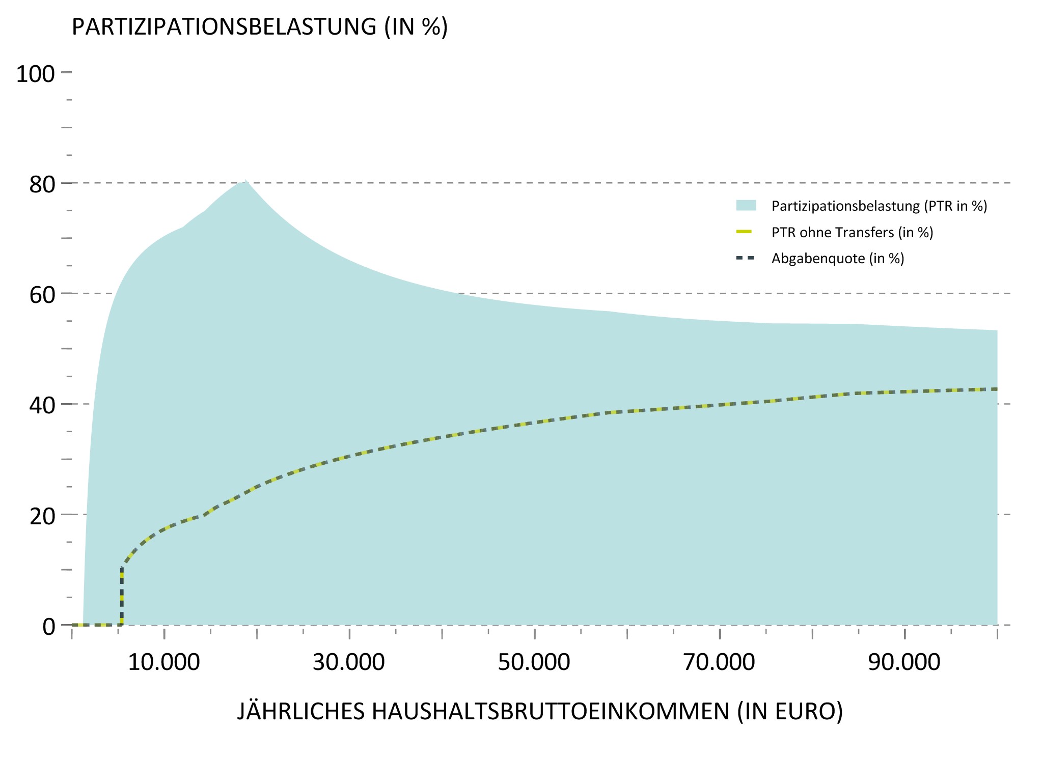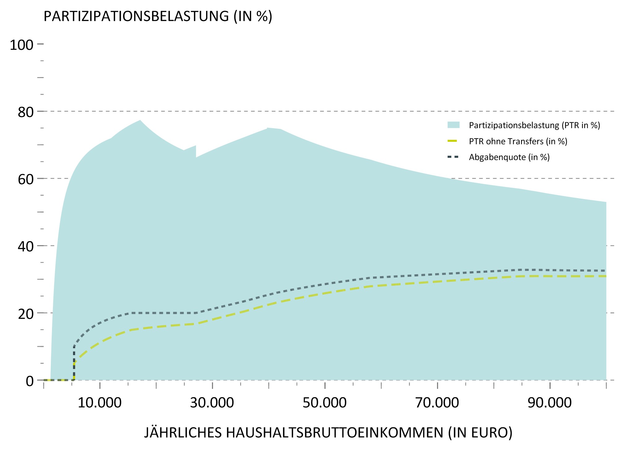 Die Partizipationsbelastung gibt an, wieviel Prozent des gesamten Bruttoeinkommens als Steuern, Sozialabgaben und/oder Transferentzug wieder abgegeben werden muss. Die Partizipationsbelastung ist ein gängiges Maß, um die Beschäftigungsanreize / Anreize zur Aufnahme einer Erwerbstätigkeit zu beurteilen. Die Partizipationsbelastung wird auf Haushaltsebene gemäß der folgenden Formel berechnet: