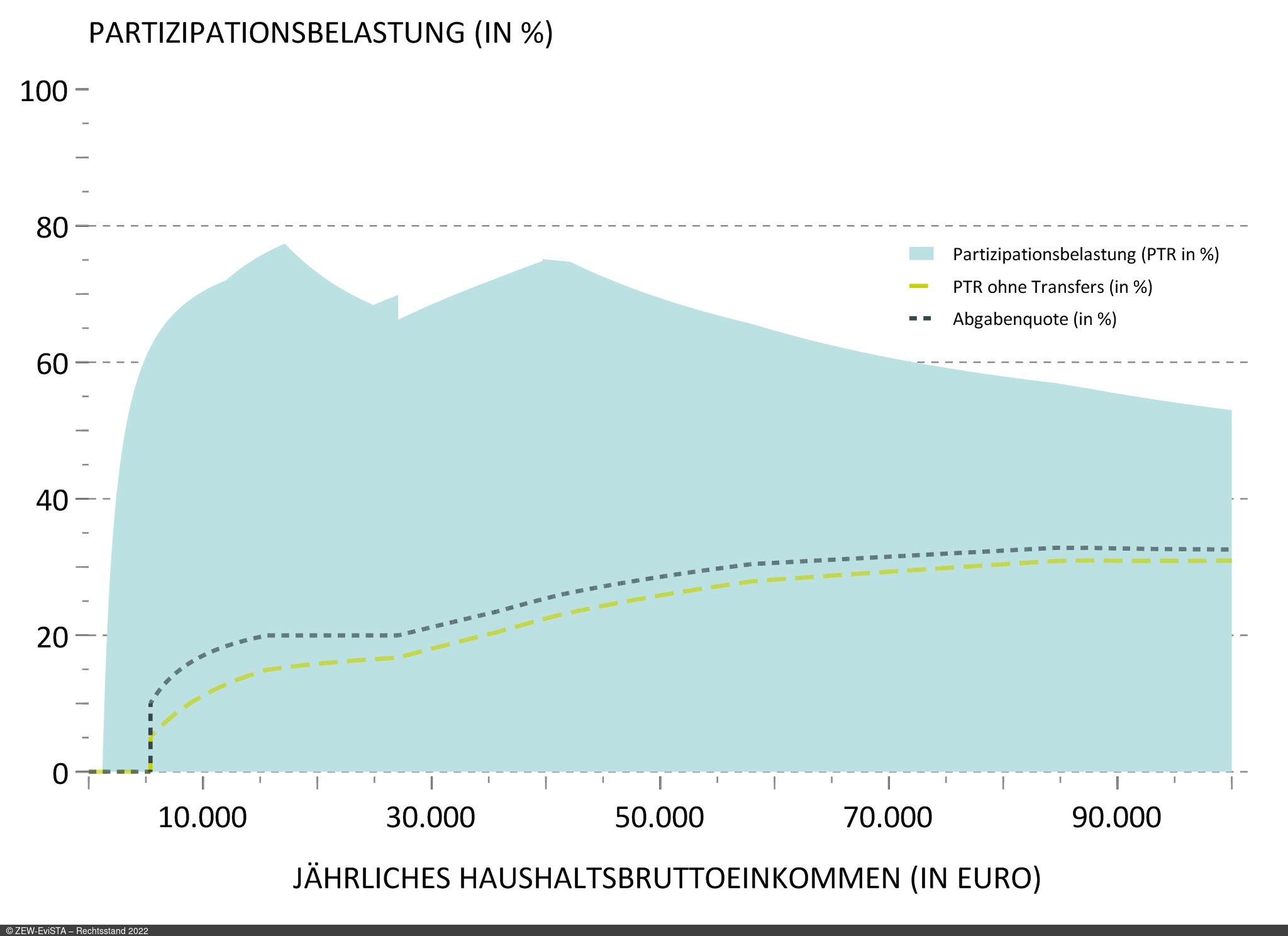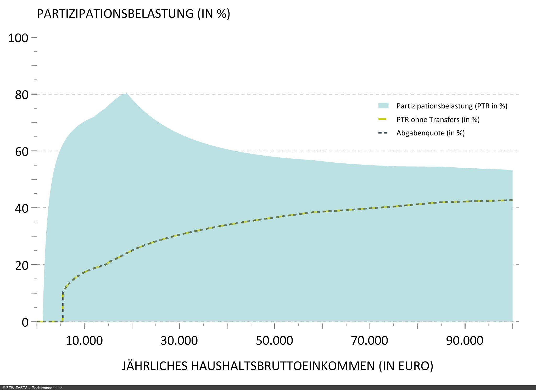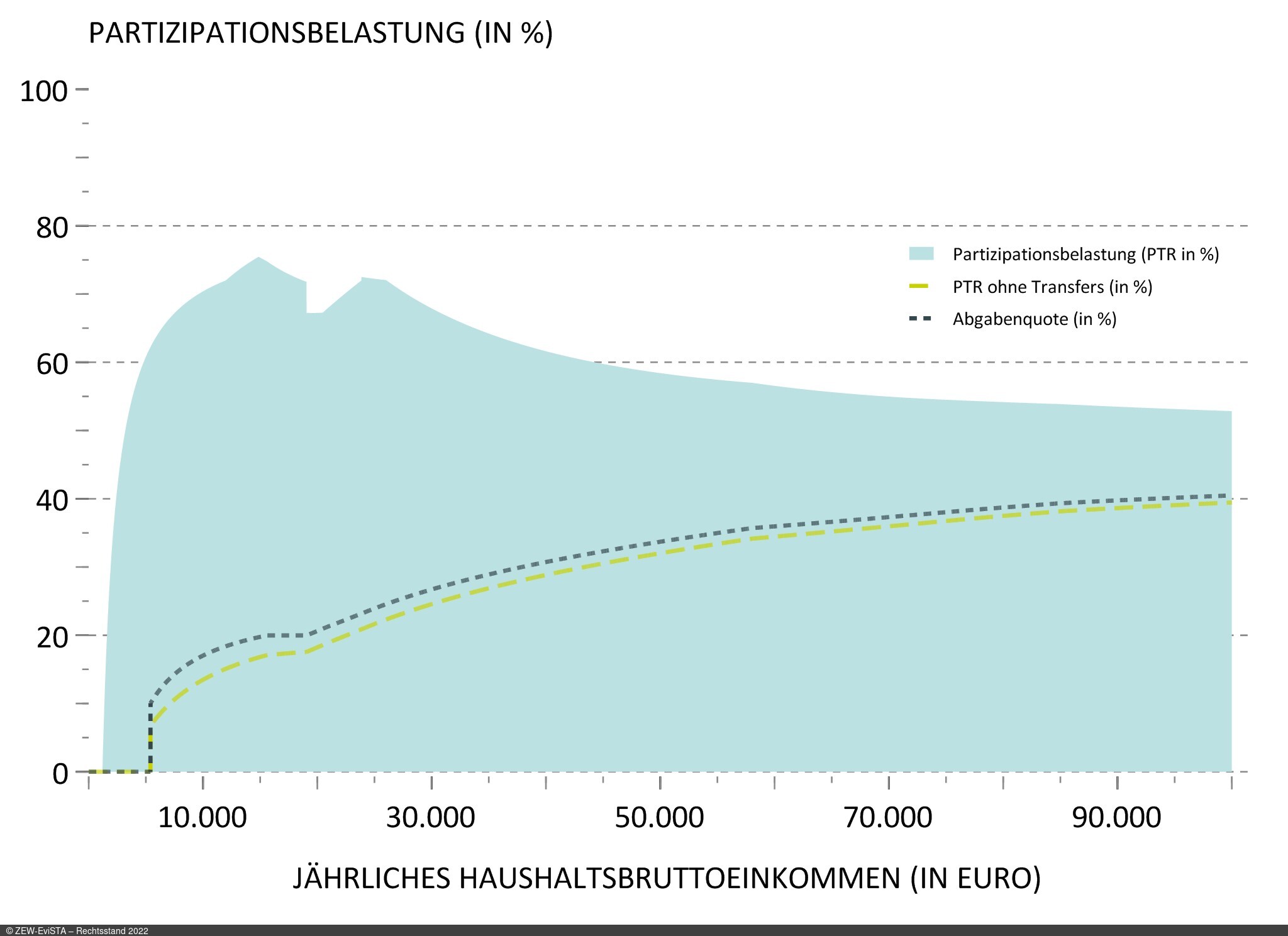 Die Partizipationsbelastung gibt an, wieviel Prozent des gesamten Bruttoeinkommens als Steuern, Sozialabgaben und/oder Transferentzug wieder abgegeben werden muss. Die Partizipationsbelastung ist ein gängiges Maß, um die Beschäftigungsanreize / Anreize zur Aufnahme einer Erwerbstätigkeit zu beurteilen. Die Partizipationsbelastung wird auf Haushaltsebene gemäß der folgenden Formel berechnet: