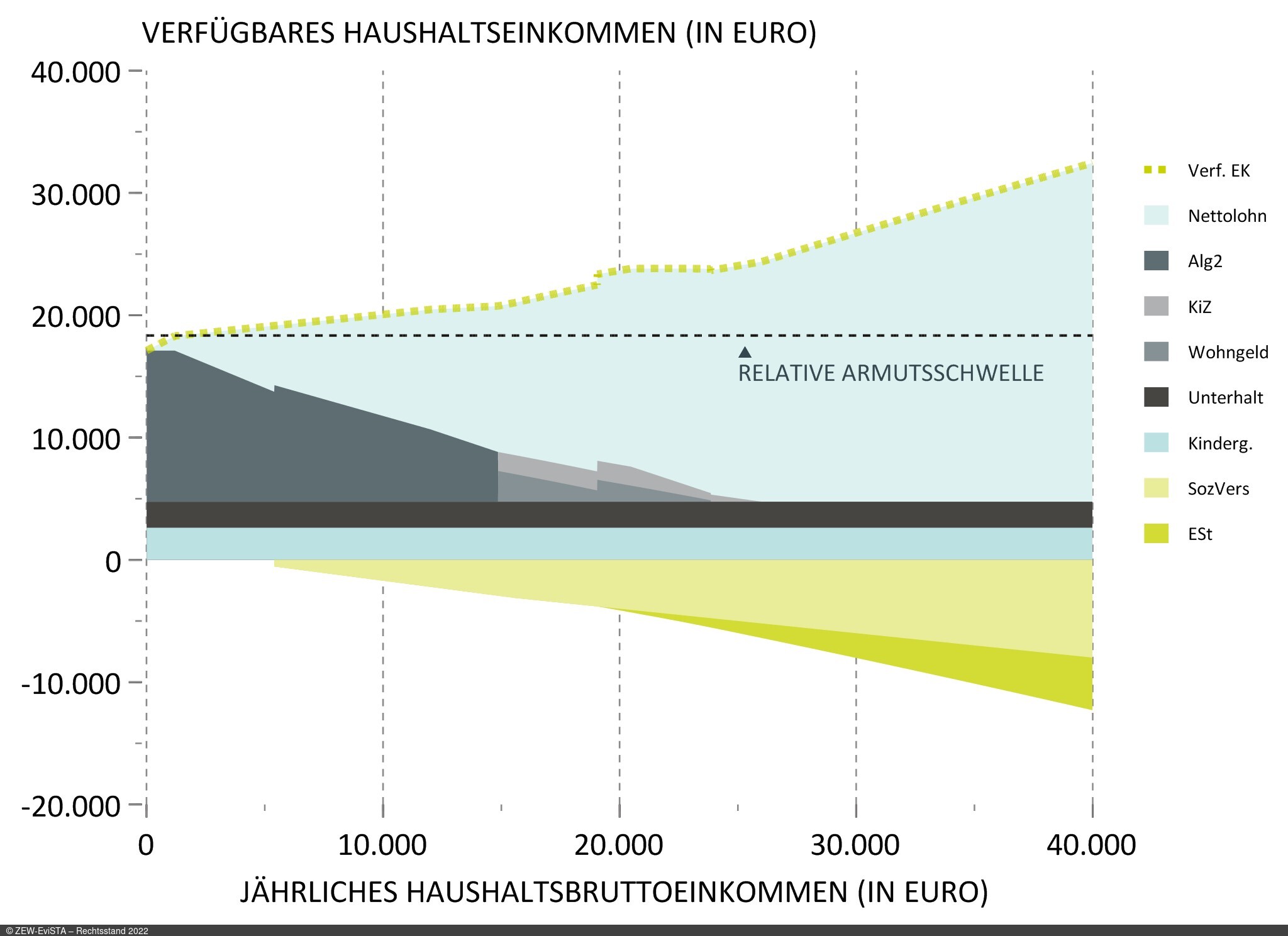 Das Mikrosimulationsmodell ZEW-EviSTA beruht auf den Daten des Sozio-oekonomischen Panels (SOEP), einer jährlichen Stichprobe von Haushalten in Deutschland. Zur Illustration bestimmter Zusammenhänge werden ergänzend sogenannte Musterhaushalte verwendet. Bei diesen werden die Haushaltsmerkmale nicht aus den SOEP-Daten übernommen, sondern frei gewählt. Festzulegen sind dabei die Haushaltszusammensetzung (Anzahl und Alter der Erwachsenen und Kinder), die Höhe und Aufteilung des Erwerbseinkommens, die Region (Ost- oder Westdeutschland) und die Höhe der monatlichen Miet- und Heizkosten, die für die Berechnung von Transferleistungen (Arbeitslosengeld II, Wohngeld, Kinderzuschlag) eine Rolle spielen.
